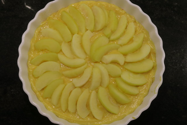Die Äpfel schneide ich in je 12 Schnitze. Der Teig sollte den Boden der Kuchenform gerade bedecken. Das ist ein bisschen delikat, weil der Teig mit dem Paniermehl auf dem Boden der Kuchenform nicht gut haftet. Mit ein bisschen Geduld geht's trotzdem. Meine Kuchenform hat einen etwas grösseren Durchmesser von 28 cm, was den Prozess nicht vereinfacht.